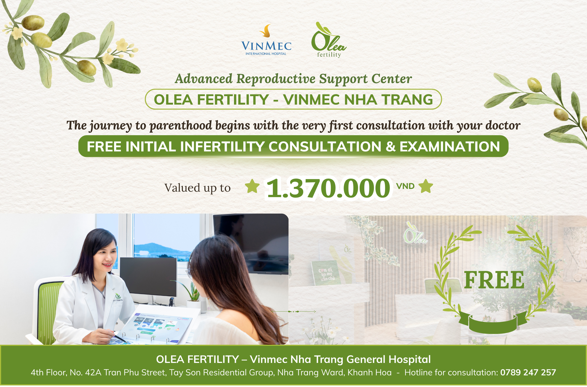 Olea Fertility – Vinmec Nha Trang is offering 100 free vouchers for an Initial Infertility Consultation and Check-up, valued at 1,370,000 VND, including: